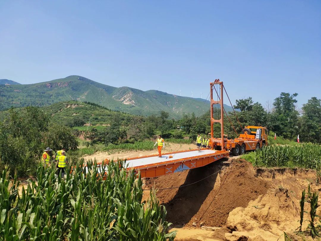 接上級(jí)公路部門通知,通往新密市牛店鎮(zhèn)花家店村因道路被毀,村民被困村莊內(nèi)數(shù)日,外界救援物資無法順利送達(dá)。2021年7月30日,我公司派出一支青年隊(duì)伍,組成公路應(yīng)急搶險(xiǎn)小組,12名隊(duì)員駕駛兩臺(tái)模塊化汽車鋼架橋,于早上7點(diǎn)整裝待發(fā)緊急前往目的地進(jìn)行救援。