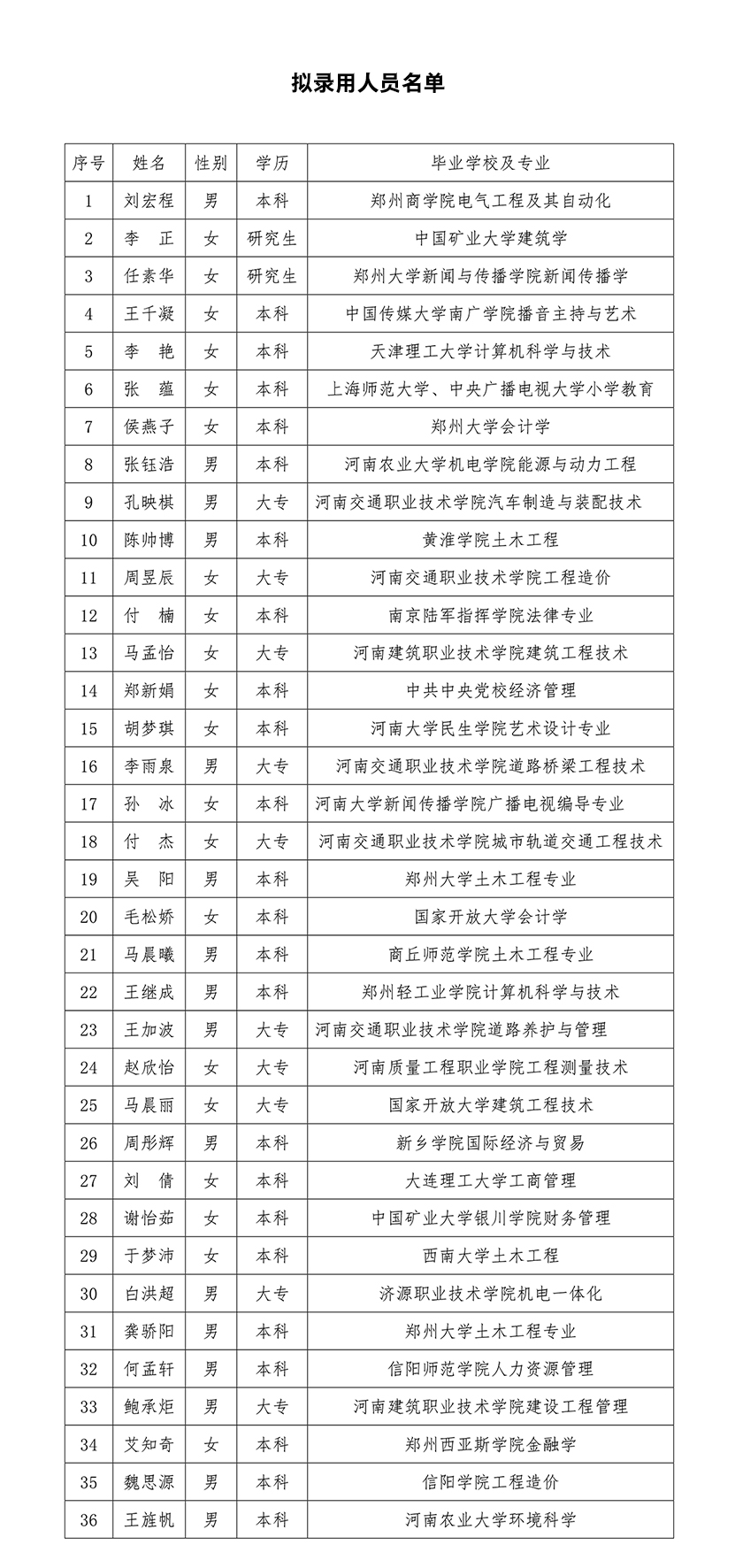 根據(jù)2023年度招聘計(jì)劃,經(jīng)筆試、面試及綜合素質(zhì)評(píng)價(jià),經(jīng)公司黨委會(huì)研究決定,擬錄用以下36名人員為我公司職工,試用期為3個(gè)月,試用期滿進(jìn)行考核,考核結(jié)果為合格及以上將予以正式錄用,考核不合格的將解除勞動(dòng)合同。